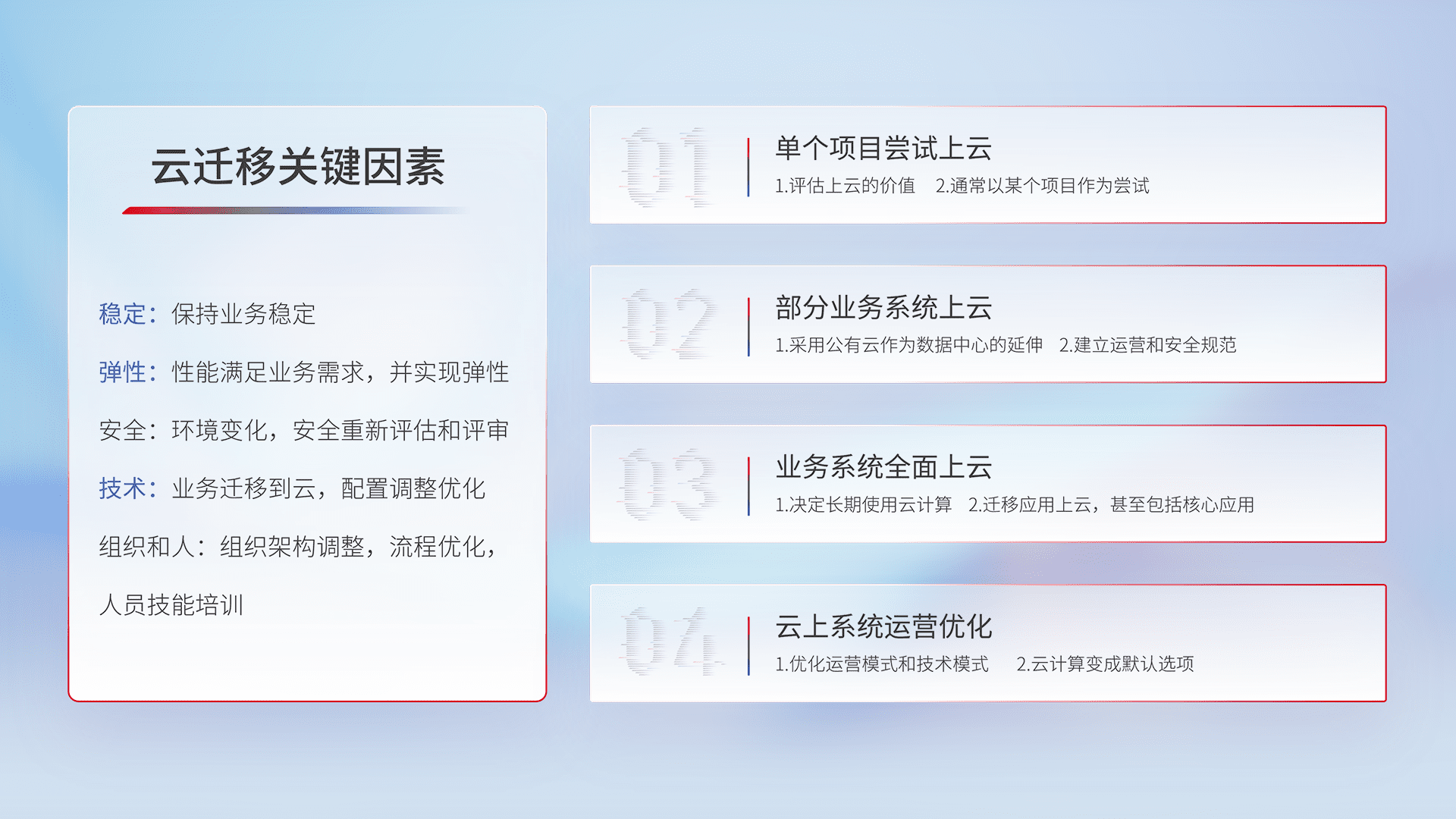 结合实际业务,,从规划设计、、云平台选型、、、、云原生改造、、、数据迁移、、集成交付,,,,迁移全过程为客户识别最佳上云路径,,做好风险识别管理,,设计网络架构、、身份权限、、安全审计合规、、操作审计、、日志审计、、监控告警策略、、、多站点容灾设计等,,对云上基础设施进行整体规划,,,提升IT治理水平,,,以满足弹性、、、高可用、、、高性能的需求。。。。