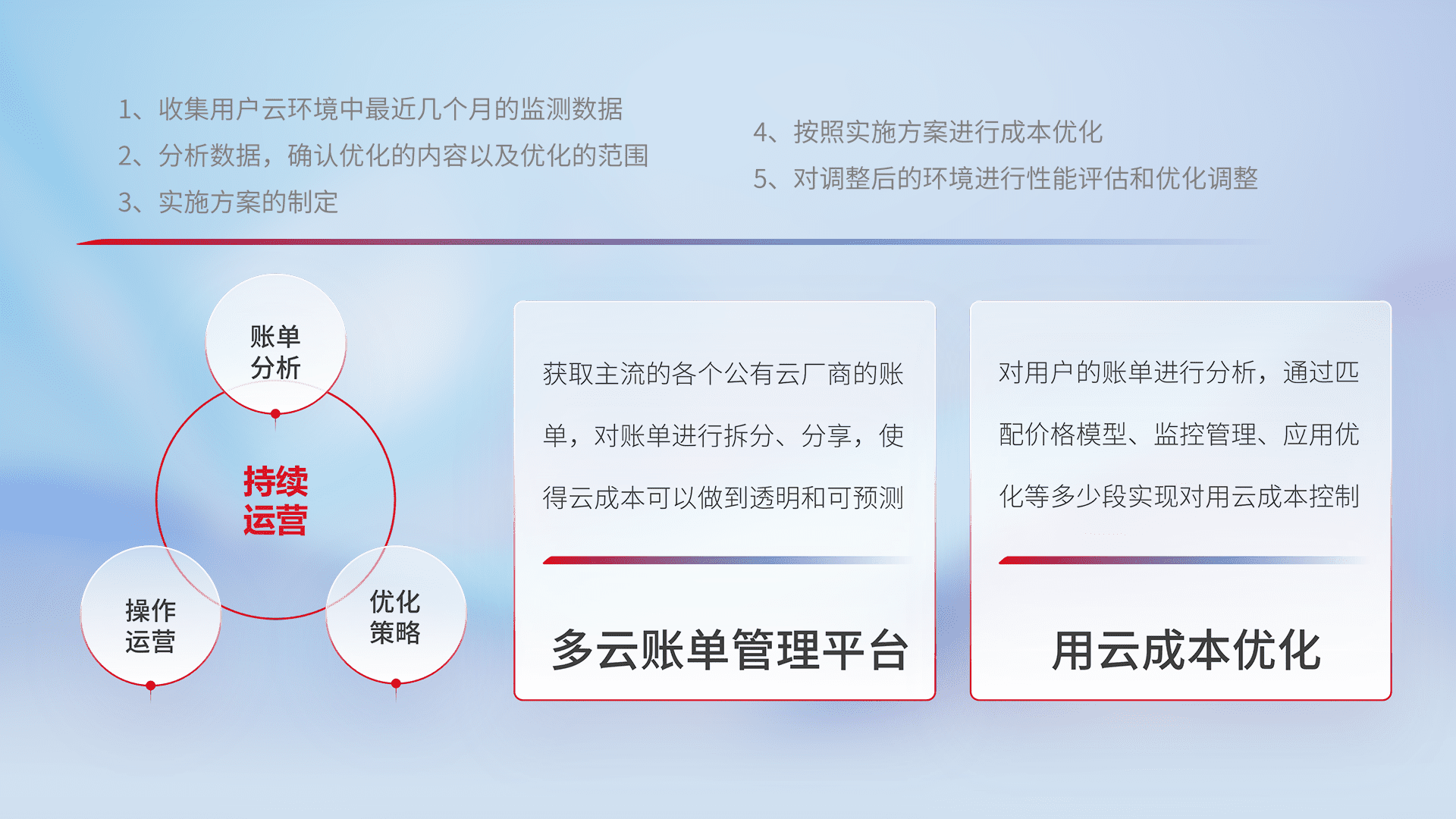 通过多云纳管,,,,以统一的资源数据模型把客户的云资源进行抽象和封装,,,,进而实现对多云资源的统一操作,,,保障云资源管理的可靠性、、、稳定性与可用性。。量身定制化运维内容,,,,配置、、、开发运维、、、补丁管理、、、、备份、、、监控、、、、认证和访问管理、、、审计和日常巡检等,,,保障在用云过程中的可靠度,,,,稳定度以及高可用率。。。